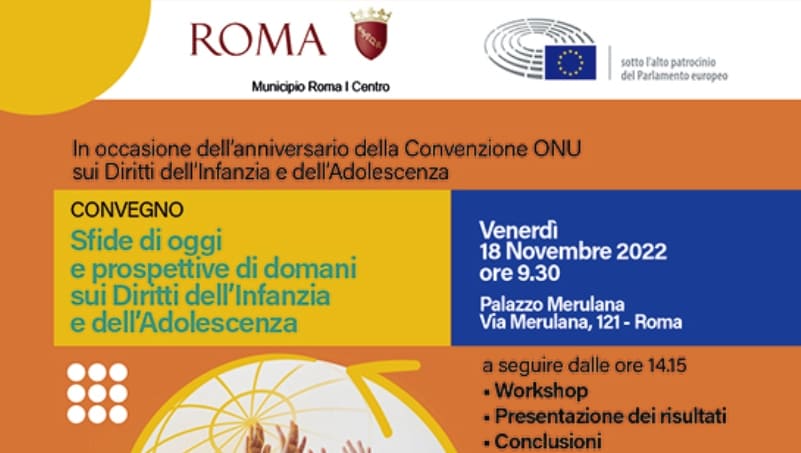 In occasione dell’anniversario della Convenzione ONU sui Diritti dell’Infanzia e dell’Adolescenza, del 1989, si svolgerà a Roma venerdì 18 novembre, a Palazzo Merulana, il convegno“Sfide di oggi e prospettive di domani sui Diritti dell’Infanzia e dell’Adolescenza”, organizzato dai Poli Interculturali del Municipio Roma I, con l’alto patrocinio del Parlamento europeo.