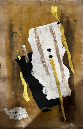 (…) Le tele di Adriana Pignataro sono emblema di una visione estatica e contemplativa dell’arte. La sua personale interpretazione del linguaggio astratto riecheggia di quadro in quadro come una sinfonia scomposta, didascalica, da cui emerge il potenziale creativo del supporto materico (…). Ottiene effetti sorprendenti in virtù della scelta coloristica, improntata sulla dicotomia tonale del bianco e nero, oppure riversata nella scelta di argento e oro. Caratteri che connotano la sua cifra stilistica. La Pignataro espone suggestivi Arazzi di tela e carta strappata.
