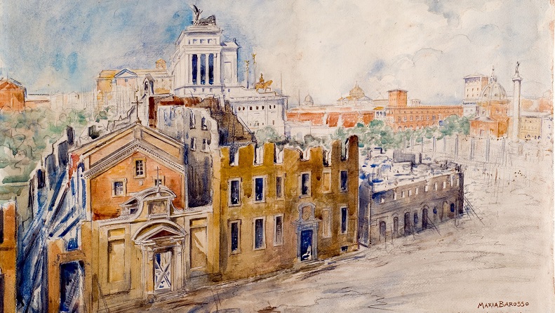La Barosso, unica disegnatrice donna attiva nei cantieri archeologici della Soprintendenza di Roma e del Lazio nei primi decenni del Novecento, seppe unire rigore filologico e sensibilità artistica, lasciando una straordinaria testimonianza delle trasformazioni urbanistiche della Capitale. Tra le opere in mostra spiccano gli acquerelli che documentano demolizioni, scavi e restauri, oltre a una serie di fogli raffiguranti affreschi e mosaici di chiese romane sottoposte a interventi conservativi.