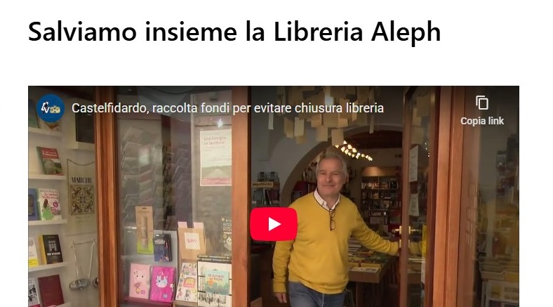 CASTELFIDARDO (AN) – La Libreria Aleph, aperta nel 1999 nel cuore di Castelfidardo, rischia di chiudere. I titolari, Moreno Giannattasio e Francesca Pierini, hanno lanciato un appello alla comunità locale, agli imprenditori, agli operatori della comunicazione, alla Regione, allo Stato e a chiunque nel mondo voglia sostenere il progetto: “La libreria crea un ponte di parole tra persone, è un antidoto alla solitudine e fa toccare con mano ai più giovani la forza dei libri, delle storie, educando all’ascolto. La libreria è uno strumento di pace. Dobbiamo necessariamente trovare le risorse economiche per poter andare avanti senza soccombere e proseguire con un buon vento”.