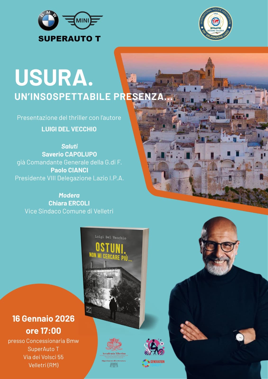 Venerdì 16 gennaio 2026, alle ore 17.00, a Velletri, in via dei Volsci 55, si terrà la presentazione del thriller “Ostuni. Non mi cercare più…”, di Luigi Del Vecchio, edito da Viola Editrice. L’ultima fatica letteraria dell’autore sarà protagonista di un appuntamento di particolare rilievo culturale e civile, dedicato al tema della legalità e del contrasto all’usura, a partire dalla letteratura come strumento di consapevolezza e responsabilità collettiva.