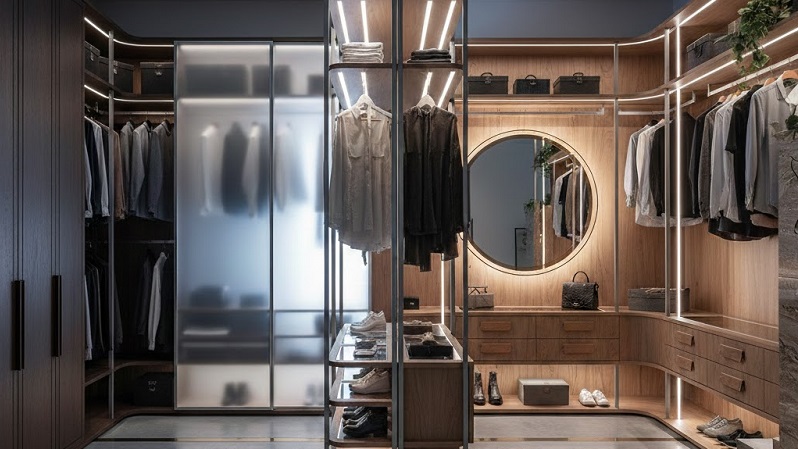 Un ruolo importante è giocato dagli accessori interni, come cassettiere con frontali in vetro, vassoi portaoggetti rivestiti in ecopelle o tessuto, e servetti. Anche l’illuminazione diventa scenografica, con barre LED fresate direttamente nei fianchi o sotto i ripiani.